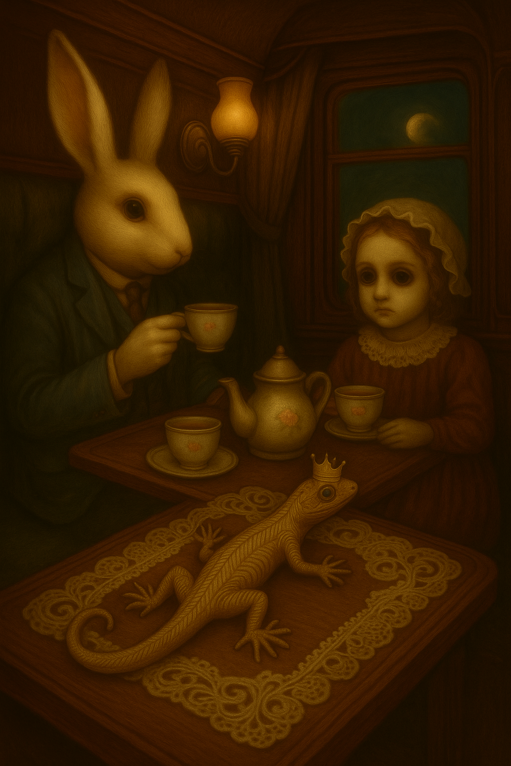 Белый Кролик сидит молча. Сегодня он тих и неразговорчив. Настроение не то. Он весь в своих думках. Иногда его хрупко-стеклянный взгляд оттаивает, и он одним глазом косится в окно. Все шесть дней, что мы в пути, над крышей нашего вагона висит ЛУНА. Так надо. Чтобы мы могли осмыслить поездку. При дневном свете этого не понять. При дневном свете думается ЛЕГКОмысленно… А наше путешествие требует старательного ТРУДНОмыслительного процесса. А, может, Патефон просто скучает по Саре?