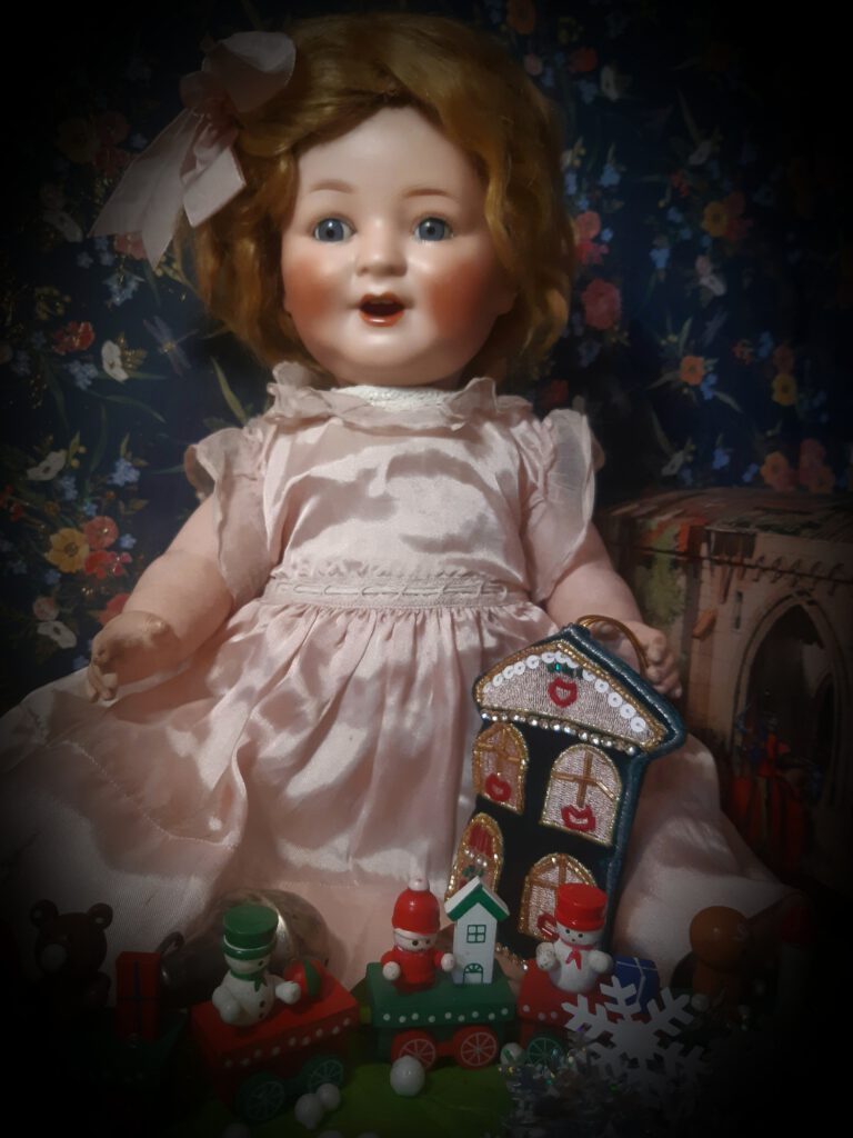 На последующих фотографиях кукла, над приобретением которой я думала очень долго)). Это кукла-пупс, производимая фарфоровой фабрикой Burggrub (Schönau&Hoffmeister) с 1925 по 1930 годы. Мне кукла очень нравится, хотя она довольно поздняя. У нее есть торговое имя „das lachende Baby“ *смеющийся малыш*. Она явная копия куклы этой же фирмы, которая производилась под торговым знаком „принцесса Элизабет“. Мне так кажется))).