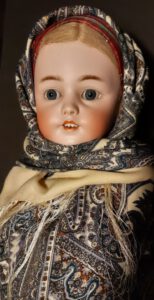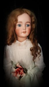 Эта немецкая красавица необыкновенна уже тем, что в ней 90 см.😲 Начало её производства датируется 1899 годом. Моя принцесса величава, сохранилась в идеальном коллекционном состоянии и ямочки на щеках , предусмотренные ОСОБЛИВО))) для этого молда, делают куклу не похожей на других. Я искала этот молд очень долго и нашла, к моему счастью, в большом размере, что меня сразу покорило. Куплена она достаточно давно и приветствует меня своей нежной улыбкой с отдельной полки, которая, естественно, была ей выделена в силу размера.