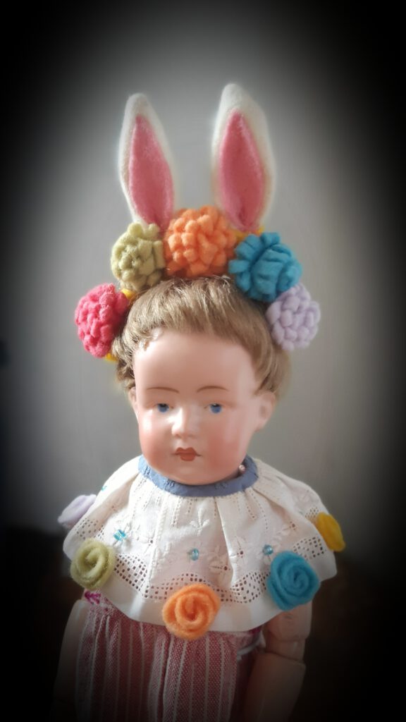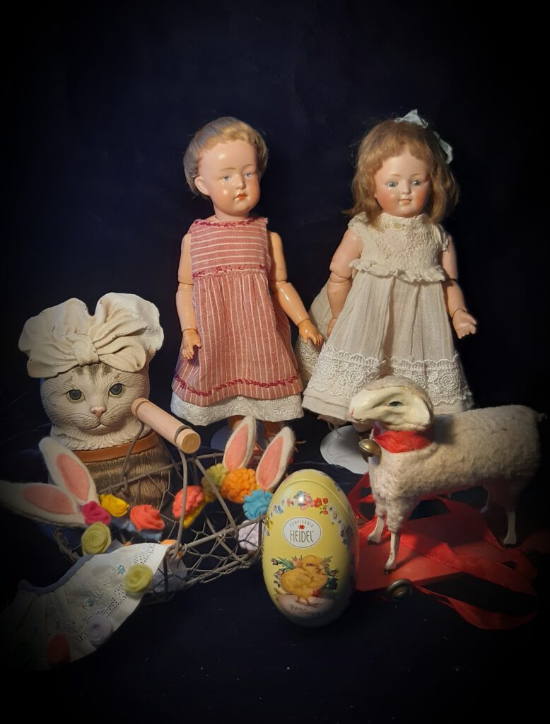 Слева: куколка с номером 340 и буквами A1M на затылке (фирма „Armand&Marseille“). Годы выпуска примерно 1925. Глаза интаглио *рисованные и вдавленные нажимом для придания живости взгляду*. Закрытй рот. 30 см. Кукла редчайшая, поздняя.